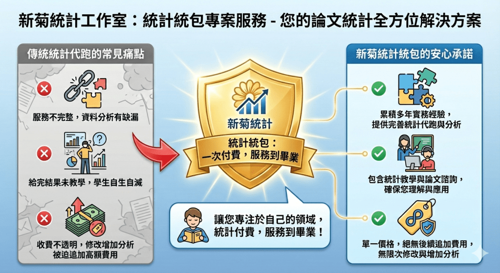 統計統包為新菊統計專案服務,本工作室累積多年實務經驗提供論文、投稿期刊完善的統計代跑、統計分析、統計教學及論文諮詢,有鑑於服務多年,本工作室常常會接到服務前一家統計代跑不完整的同學,或給完分析結果後亦未教學,任其自生自滅,或一開始就未講清楚服務收費細項,以致於日後修改或增加分析都被迫追加不少的費用,有鑑於此本工作室聽到很多學生的心聲,提供「統計統包」的概念,讓學生專注於自己的領域,統計就交給專業來處理,「統計統包」 只有一個價格,日後決不會因修改、增加分析而多收您一塊錢,適合對統計不了解的您。